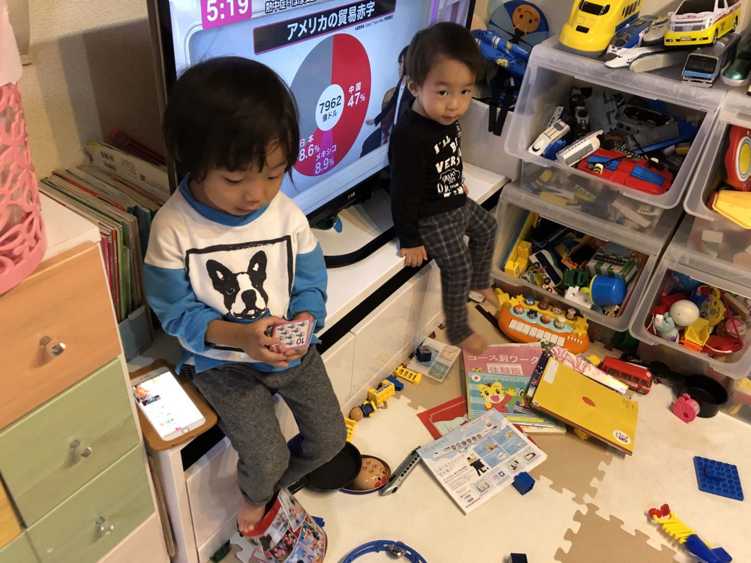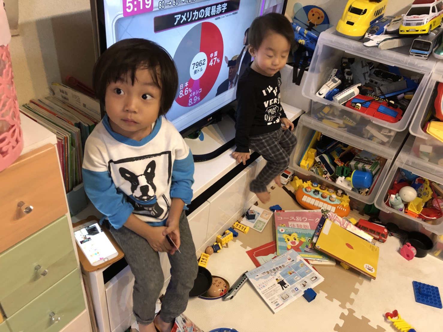 정신없이 좁은 거실을 장난감과 책으로 뒤덮어놓고