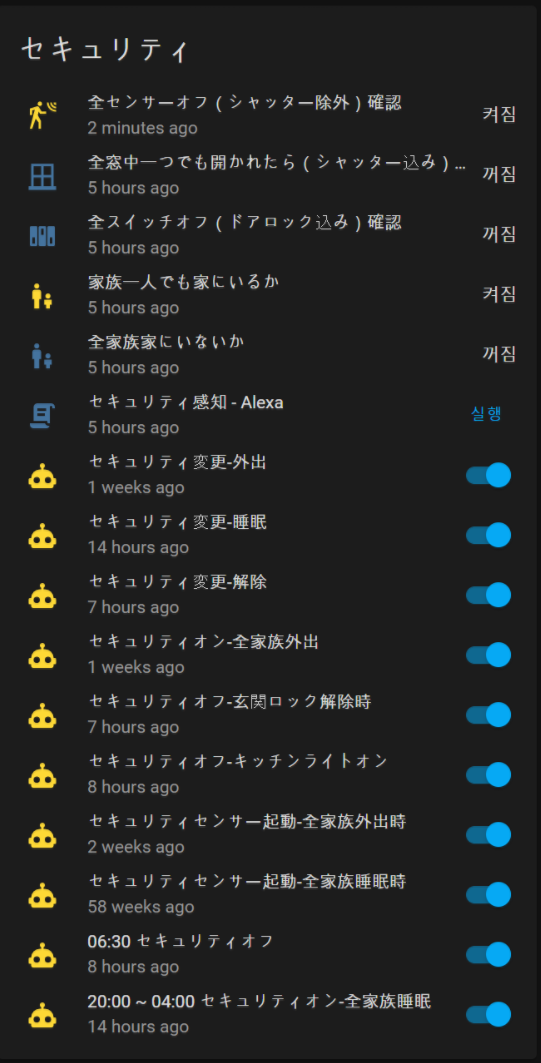 각각 감지센서의 감지, 스위치의 상태변경, 각종기기의 상태변경이 감지되면 자동화가 실행됩니다.