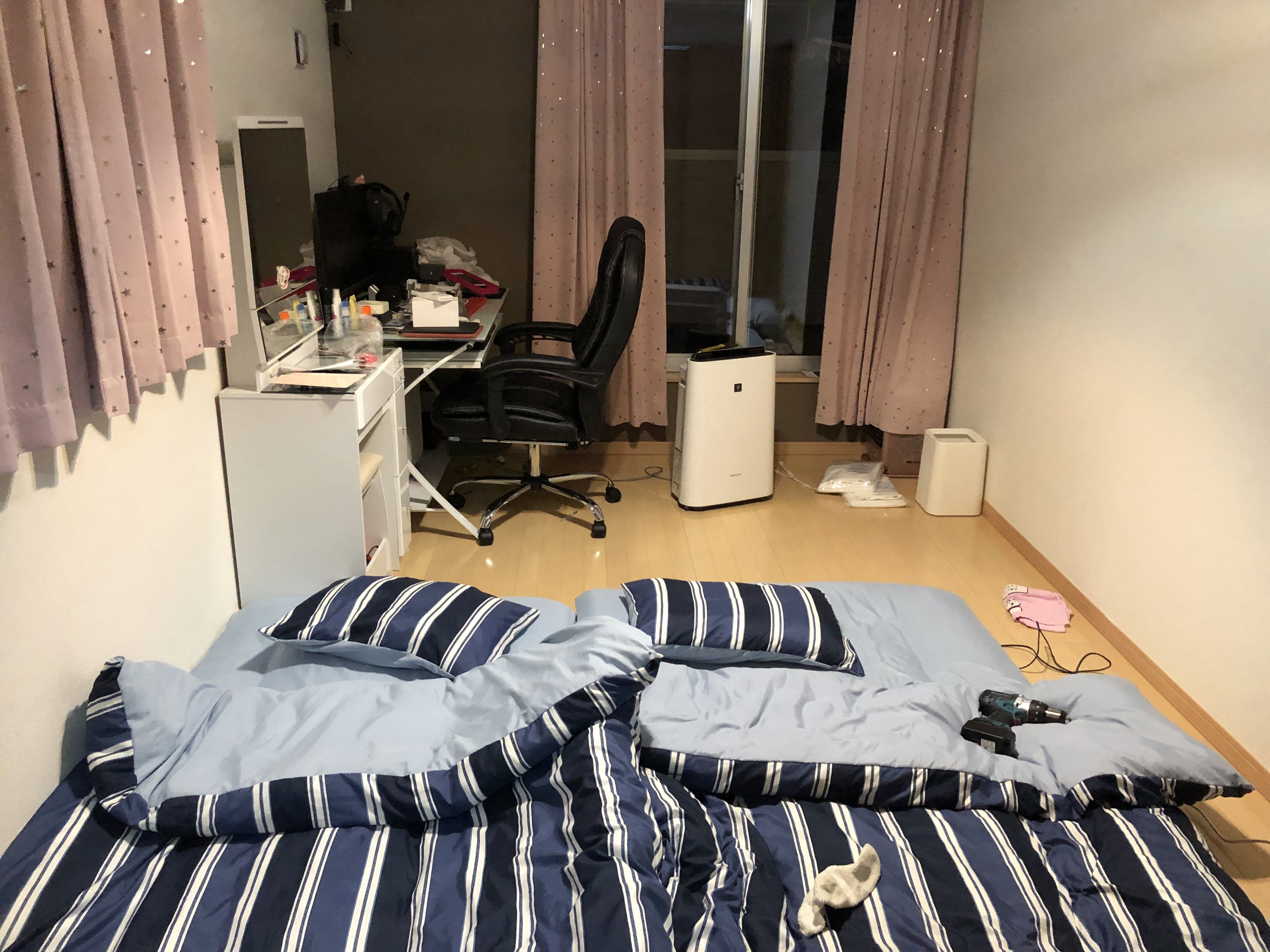 싱글 매트리스, 더블 매트리스 붙여놓고 왼쪽부터 레이, 카즈미, 유노, 저 순으로 자게 됩니다. ㅋㅋㅋㅋ