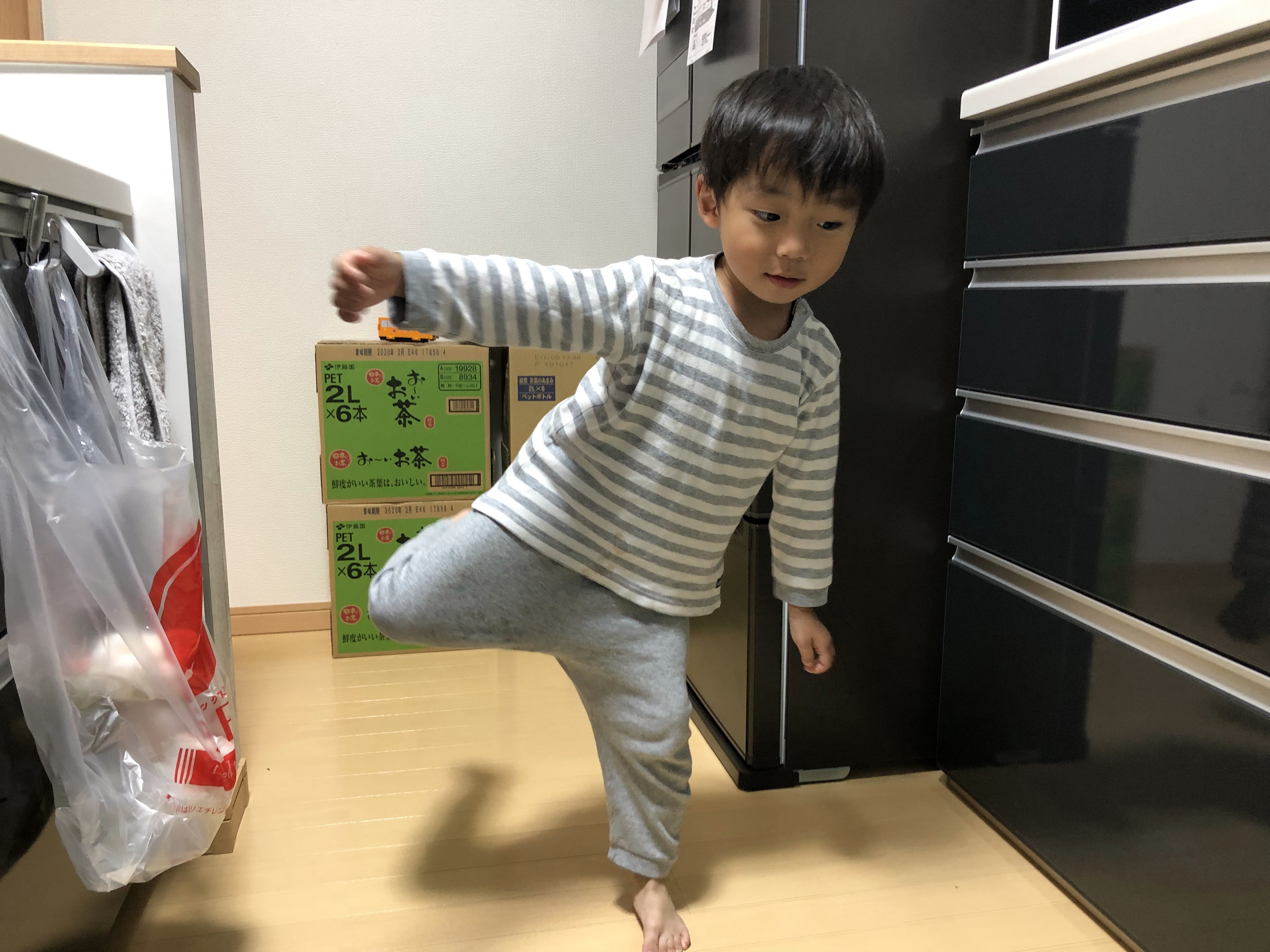 아빠 앞에서 한발로 서서 밸런스 잡아보는 유노.