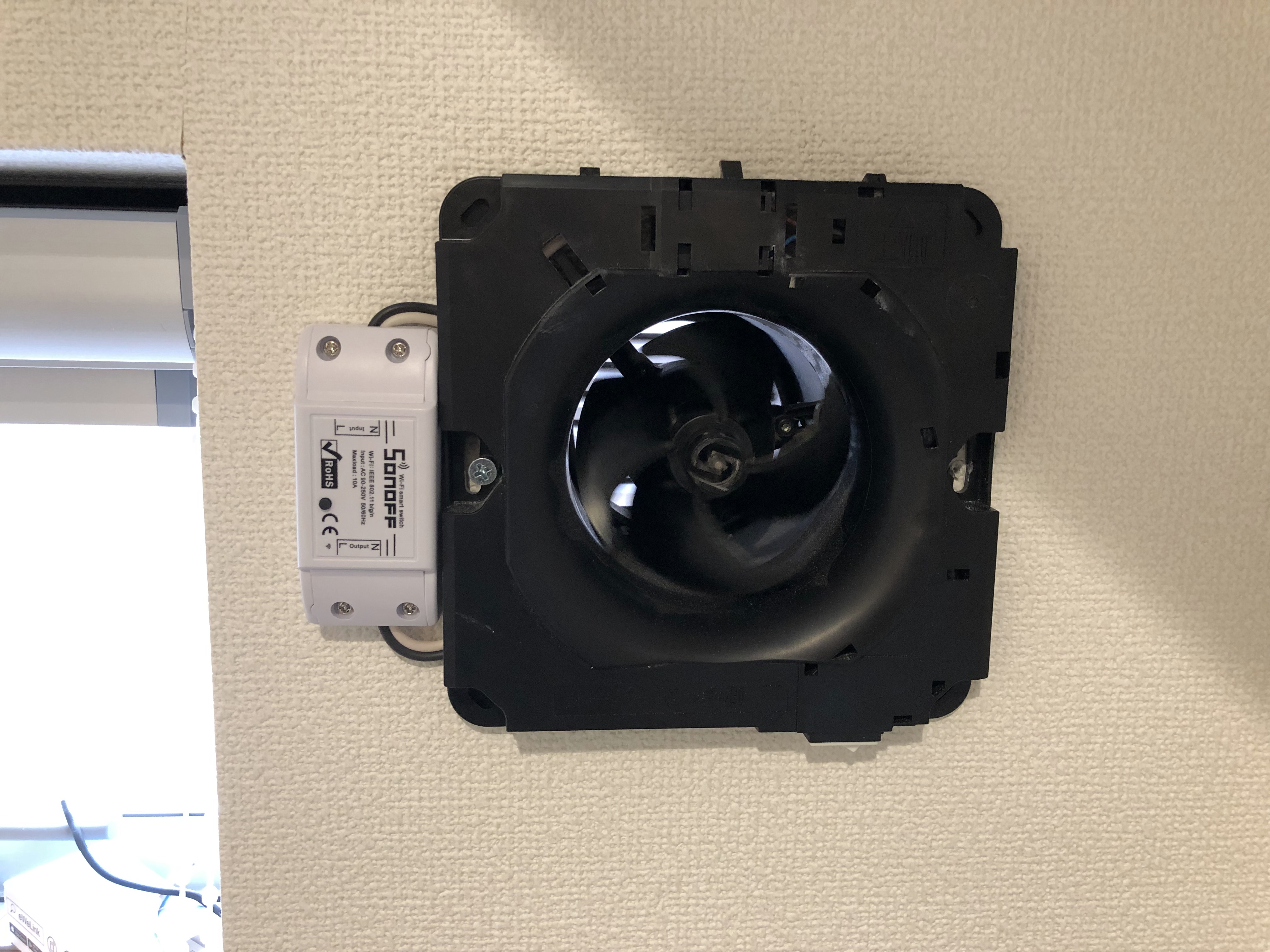 화장실 환풍기를 열어봤습니다만, 안쪽에 공간이 없어서 밖으로 선을 빼내어 이렇게 우선 고정했습니다.