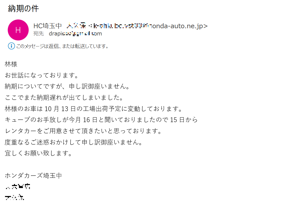 임상의 차는 10월 13일에 공장출하예정으로 변동되었다.