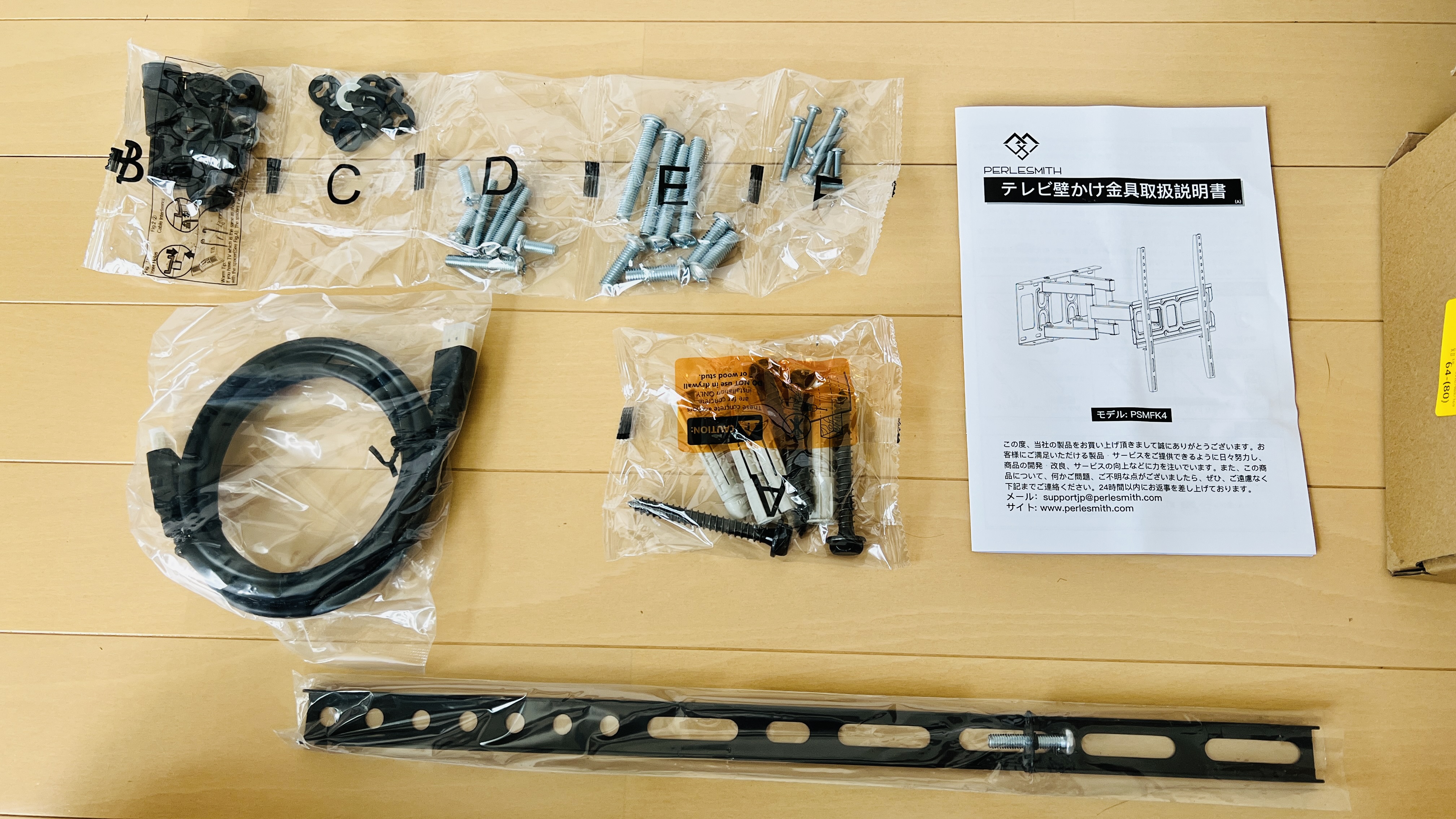 박스를 열면 벽걸이 본체와, TV뒤쪽 브라켓 2개, 각종 볼트 너트들, 설명서, 보너스 HDMI케이블이 있습니다.