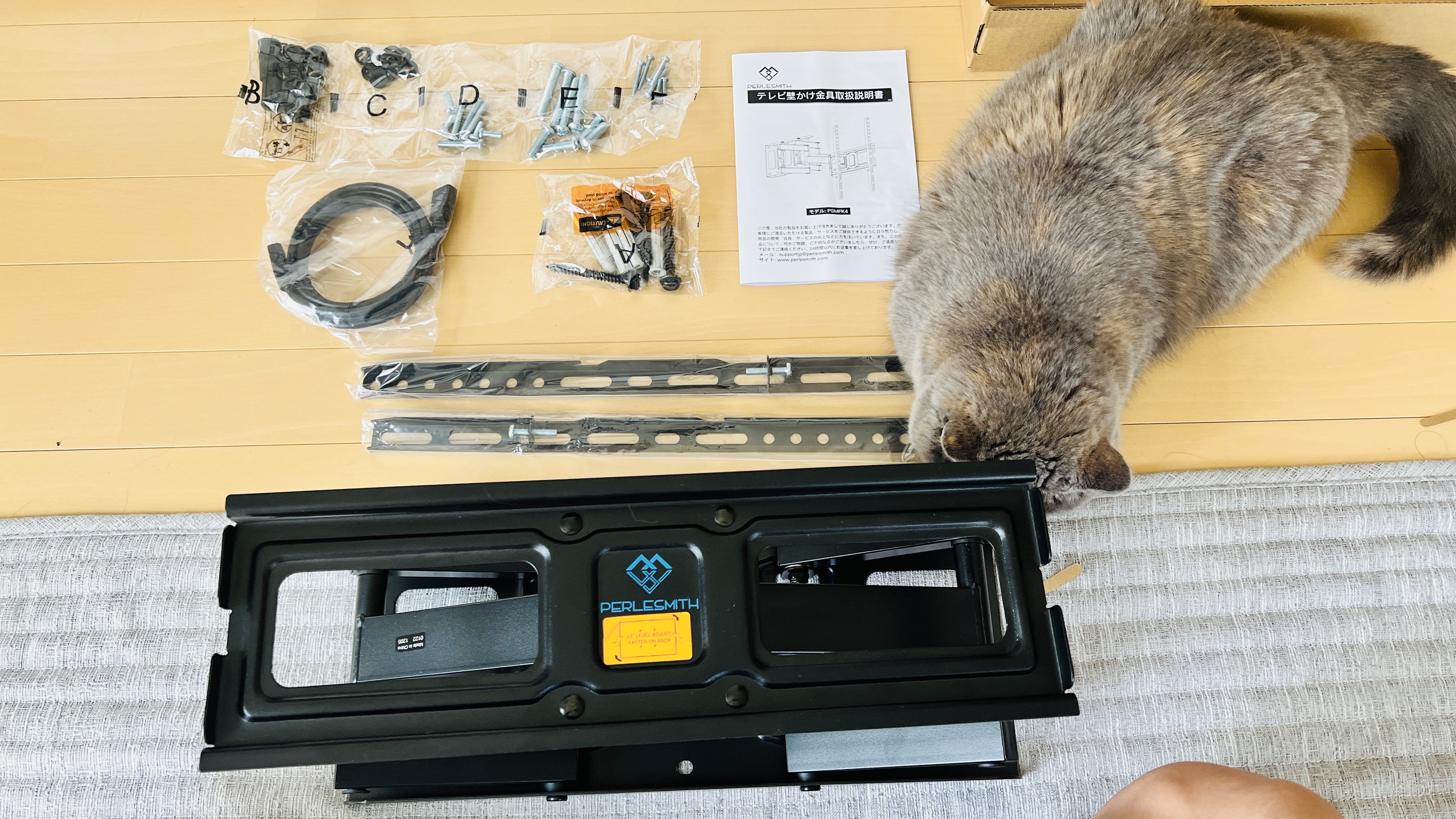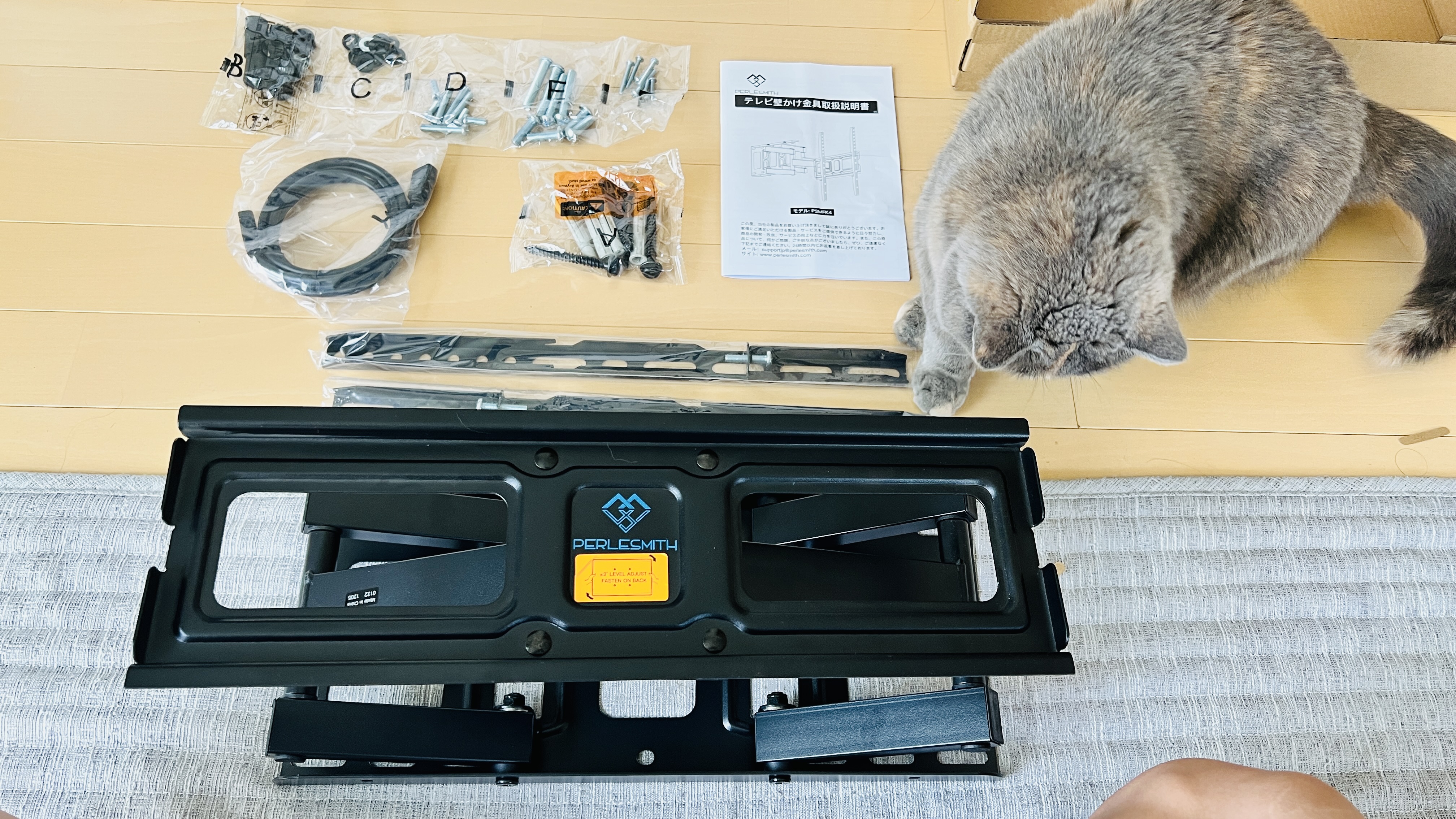 박스를 열면 벽걸이 본체와, TV뒤쪽 브라켓 2개, 각종 볼트 너트들, 설명서, 보너스 HDMI케이블이 있습니다.