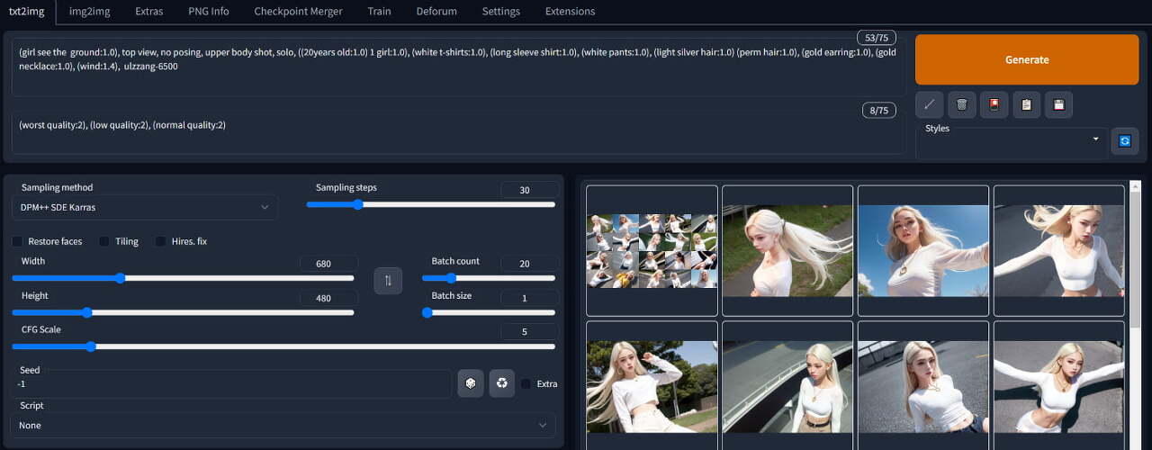 이 게시글 맨 위에 있는 시작 프롬프트로 변경한 다음, (girl see the ground:1.0), top view, no posing,"을 추가한 다음 돌려봅시다.