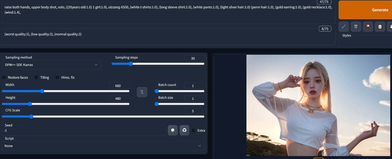 프롬프트 맨 앞에 raise both hands, (양손 들기)를 추가하고 신나게 제너레이트 버튼을 눌러봅시다.