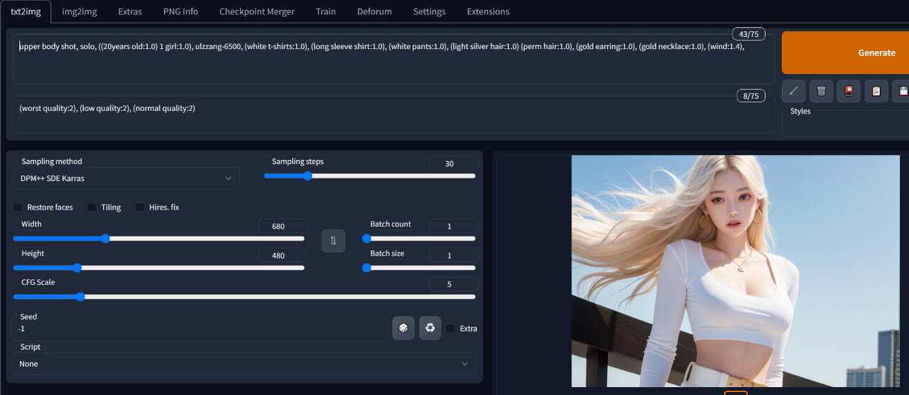 프롬프트대로 바람에 흩날리는 밝은 실버(실패) 긴머리에 금 귀걸이 목걸이 한, 하얀색 옷입은 여자네요. ㅋㅋㅋ