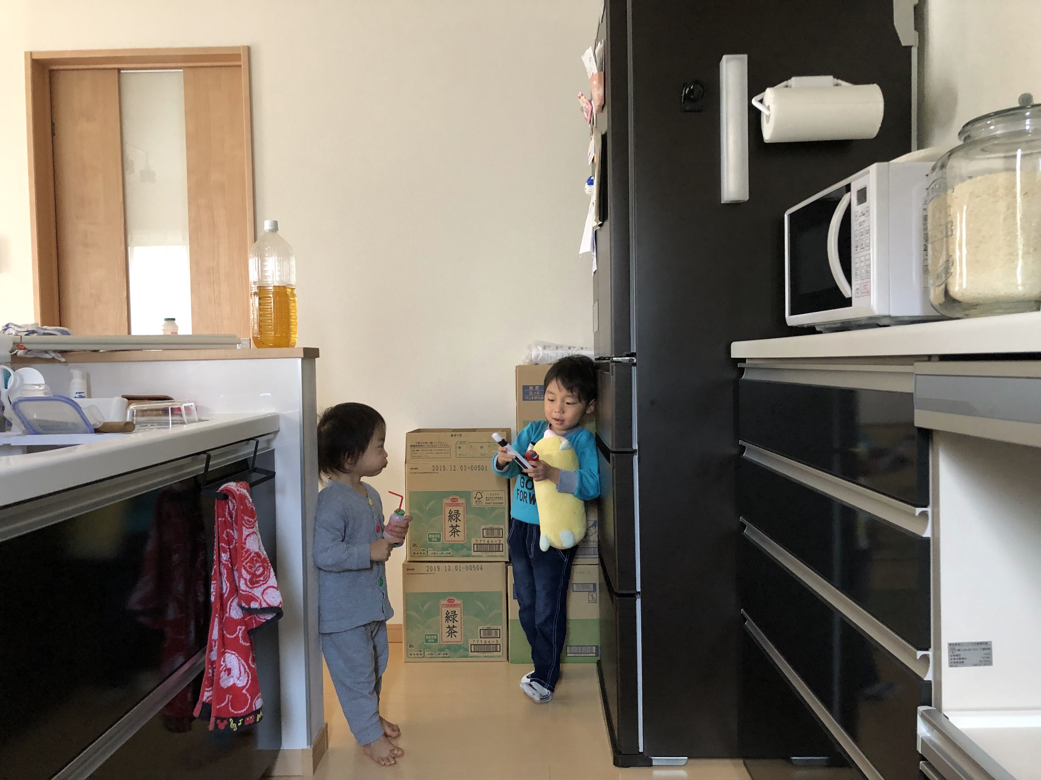 인형 안고 있는 유노와, 요구르트 마시며 주방 입구에서 담소를 나누는 레이.